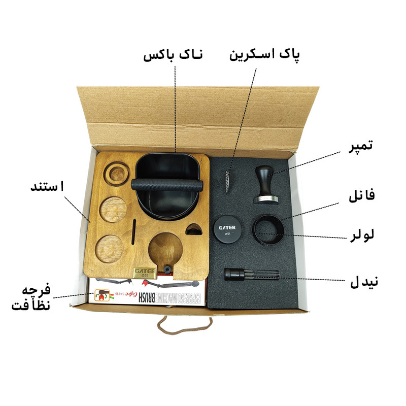 در این مجموعه ابزارهای کلیدی مانند تمپر، لولر، فانل، نیدل دیستریبیوشن، فیلتر پاک اسکرین، فرچه نظافت و پیمانه پودر قهوه قرار گرفتهاند تا تجربهای دقیق و حرفهای از عصارهگیری قهوه برای شما فراهم شود.